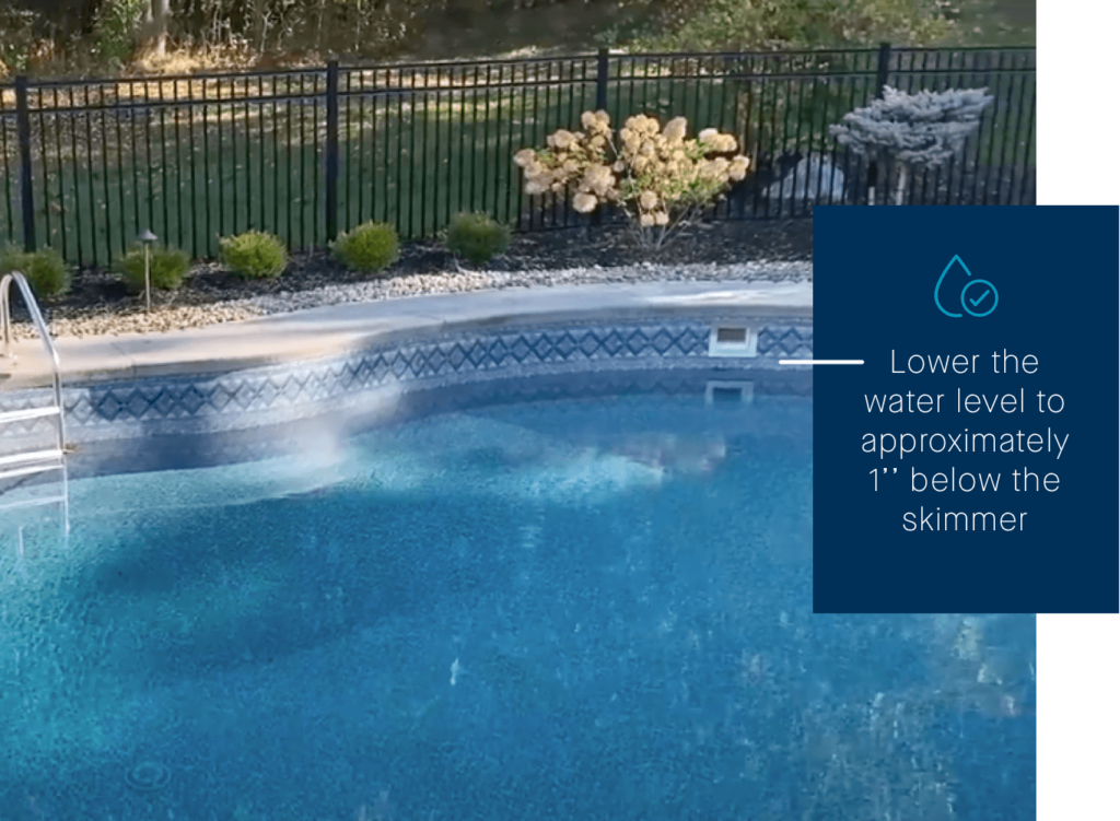 As a general rule, you want to lower the water level to approximately 1” beneath the skimmer. You never want to drain your pool completely. If you feel there’s a need to drain your pool, contact a pool professional.