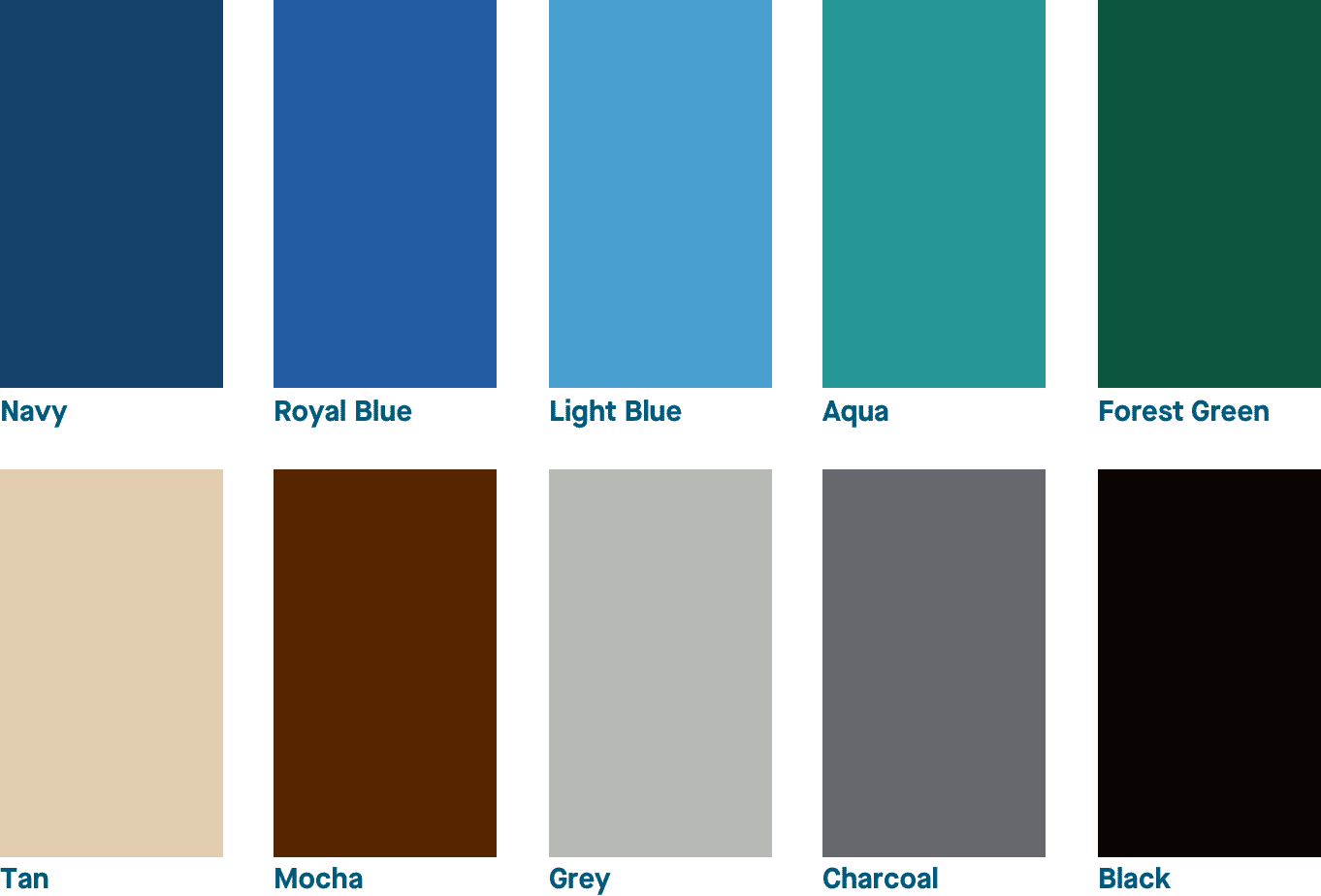 Navy, Royal, Light Blue, Aqua, Green, Tan, Mocha, Gray, Charcoal, Black.